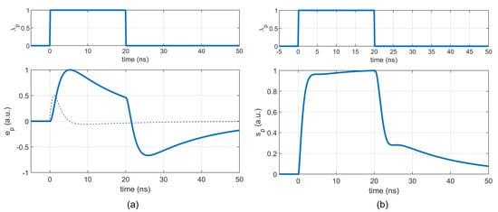 Figure 8 shows the simulated response of the mean and standard deviation to a 20 ns square optical pulse for the waveform (5) with parameters from Figure 4. To better understand the waveform, the plot also contains a single pulse plotted with a dashed line. With respect to (21), ∝ for . Thus, the maximum edge slope of corresponds to the maximum of and the maximum of corresponds to the zero crossing of .