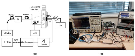 Figure 9 shows the block diagram and photograph of the experimental setup for measurements of SiPM response to weak optical pulses. The photomultiplier is located in a chamber and is illuminated by a multimode optical fiber. The optical pulses are generated by an 850 nm VCSEL from a modified Gigabit Ethernet SFP module. The laser is driven directly from a port of Xilinx ML-505 FPGA board (San Jose, CA, USA) without any DC pre-bias. A RC network is used between the 3.3 V FPGA output and the laser to limit the operating current and to compensate for the slow rising edge of unbiased VCSEL. This arrangement ensures that the laser is actually turned off outside the pulse duration. An optical attenuator decreases the pulse power to a suitable level. The chamber also contains a regulated and optically attenuated LED to simulate the background radiation. The SiPM supply current is monitored with a precise Keysight 34465A ammeter (Colorado Springs, CO, USA).