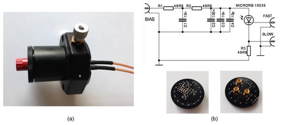 Figure 10 shows the measuring chamber designed from Thorlabs optomechanical parts. The ON Semi photomultiplier MICRORB-10035 (Phoenix, AZ, USA) is placed in the middle of a 1 inch round-shape printed circuit board with MMCX connectors. The biasing scheme is recommended by the manufacturer []. The positive terminal of the power supply is grounded to get ground-referenced output signals. The fixture has two outputs: “SLOW” () sensing the photomultiplier supply current and “FAST” () with a capacitive-coupled output shown in Figure 1b. Table 1 summarizes the typical datasheet parameters of MICRORB-10035. All measurements were done for bias voltage = 33 V. During the experiments, the chamber was wrapped in aluminum foil to block room light, which leaked in through the printed circuit board, as shown in Figure 9b.