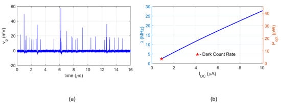 The first point in Figure 11b corresponds to the room-temperature dark count rate. The obtained values DCR = 2.5 MHz and A correspond well to datasheet values. Then, the LED current was increased and the process of spontaneous “dark” breakdowns merged with photon-induced breakdowns with an expected linear dependence of the rate on current