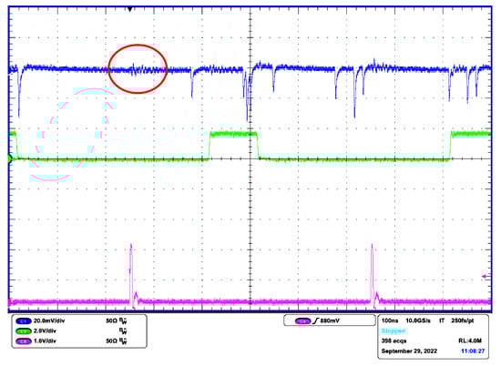 Raw signals captured by oscilloscope (Channel 1—SiPM output ; Channel 3—FPGA pulse to VCSEL, Channel 4—sync pulses). The red circle shows electrical crosstalk from sync pulses.