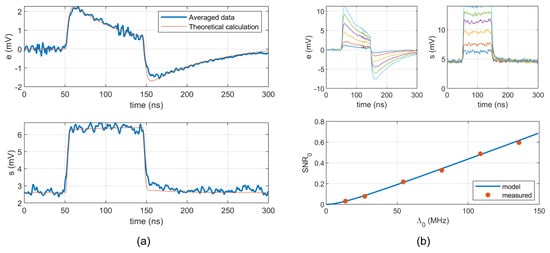 A software procedure was used to find “unity” pulses in the recorded signal. The waveform (5) was fitted to the pulses with following parameters: = 22.5 mV, s s and s. The theoretical waveforms for e and s were calculated using (21) and (22), and plotted in the same figure for comparison.