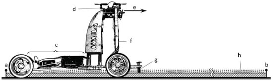 Dynamic experiment setup: mobile stand on rail; (a,b) beginning and end of rail; (h) optical obstacles (pins); (g) optical infrared sensor; (c) pcu, batteries, and motors; (d) Crazyflie 2.0; (e) direction of movement; (f) laser pointer. Optical sensor aligned with drone’s antenna.