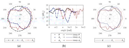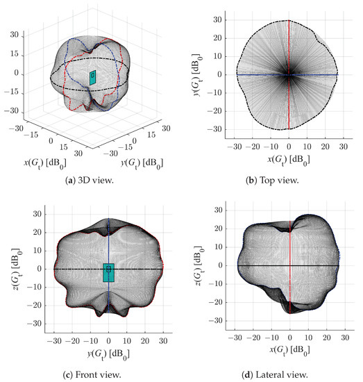 In order to reconstruct the 3D radiation pattern from the three measured sections in the azimuth (, elevation-1 () and elevation-2 () planes (see Figure 3), we formulate a linear combination of the boundary values of the considered quadrant. Using the system of Equations (14), the 3D radiation pattern depicted in Figure 4 can be obtained.
