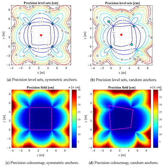 The CRLB analysis carried out here considers two different representative distributions of four anchors, namely, a symmetrical layout and a random one, as shown in Figure 5. The ripples of the contour lines in Figure 5 are to be expected due to the anisotropy of the radiation pattern in Figure 4.
