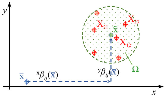 In order to explain the proposed debiasing process, we begin by defining the debiased measurement as , the measured posistion as , and the cloud of actual positions as , as shown in Equation (15) and Figure 7.