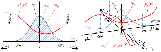 For the purpose of the following derivation, continuous interpolating functions of the x and y biases, both along the and axes, have to be obtained (e.g., cubic splines). Therefore, from the biases of x measurements around any position, two interpolating functions can be obtained, namely, and along the and axes, respectively. Likewise, and interpolating functions can be defined for the biases of y measurements. The aim is to write weighted averages of the biases around the estimation position in order to estimate the expected biases. However, instead of performing a surface integral, the average of two integrals in perpendicular directions is considered. Figure 8 (left) depicts the problem in the direction for the bias of the measurement of the x-component of the position. Thus, the interpolated bias function multiplied by the weighting probability distribution is integrated in the x direction and normalised by the length of the considered interval. A coverage factor of is set, which means that approximately 99% (level of confidence) of the measurements of the real position fall in the interval between and , where is the standard deviation of the Gaussian distribution . The same integral can be evaluated in the direction and the two integral values can be averaged in order to obtain the corrected bias value of the x-component measurements, as shown in Equation (17) and Figure 8 (right). The same process can be applied for evaluating the corrected bias of the y-component measurements, as in Equation (18).