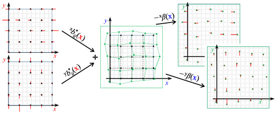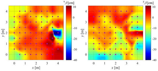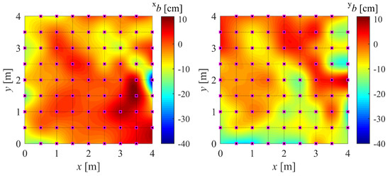 Therefore, while the original experimentally-obtained biases were distributed on a regular quadrangular grid , the new corrected biases can be distributed over a deformed grid . As shown in Equation (20), the two new corrected bias distributions of the x () and y () measurements can be interpolated, obtaining bias surfaces that are functions of the measured positions.