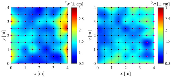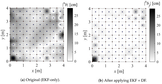 For simplicity, our version of the IPS (with built-in EKF + DF) is referred to as IPS-2, while the original version (only with built-in EKF) is referred to as IPS-1. In order to build the maps, a large number of measurements () are taken at a sampling frequency of 100 Hz while keeping the drone stationary for at least 30 s on each marker (). The drone is kept aligned with the x axis and parallel to the floor, as the effect of its attitude is not being investigated. Finally, the bias (b), standard deviation (), and mean squared error (MSE) are computed. For instance, their values in the x direction (superscript ) are as in Equation (22), where is the position measurement. The resulting maps can be found in Figure 10 and Figure 11.