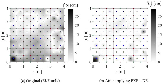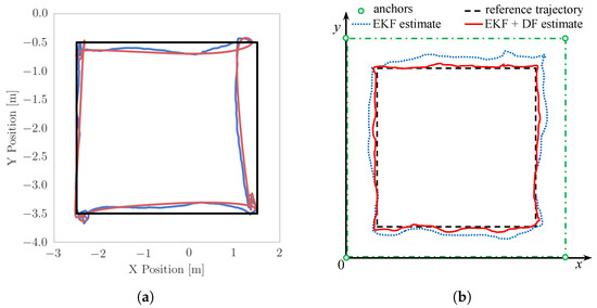 In our experimental setting, the object to be positioned is a Crazyflie 2.0 nano-quadcopter and the IPS is bitcraze’s Loco Positioning System [56]. This is setup already equipped with an Extended Kalman Filter (EKF) [57,58], which transforms raw sensor measurements into better estimates of the state of the drone (i.e., higher precision). The EKF developers note that the position estimates are affected by a measurement bias which appears to be non-uniform in space. In other words, the quadcopter is estimated to be in a position that is shifted from the actual one. To address this issue, we proposed that a debiasing filter be incorporated here after the built-in EKF.