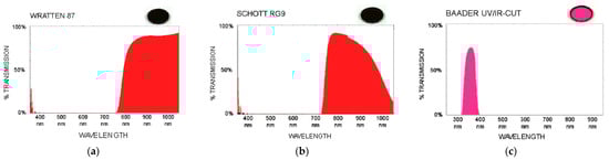 (a) IR Longpass filter Wratten 87; (b) IR Longpass filter Schott RG 9; (c) UV Shortpass filter Baader UV/IR-cut.