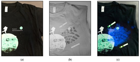 Images of black cotton shirt with traces of latent blood photographed (a) with conventional camera and illuminated with white visible light, (b) by Invespector illuminated with IR radiation 850 nm and (c) after applying a chemo locator, such as Bluestar.