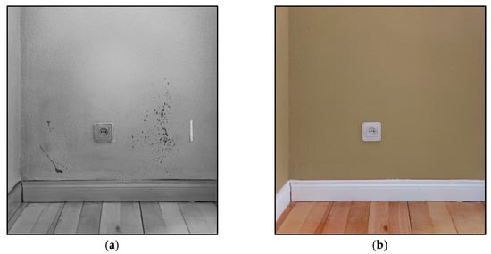 Images of a wall with traces of latent blood under a layer of acrylic paint: (a) photographed with a conventional camera and illuminated with white visible light and (b) by Invespector illuminated with IR radiation 850 nm.