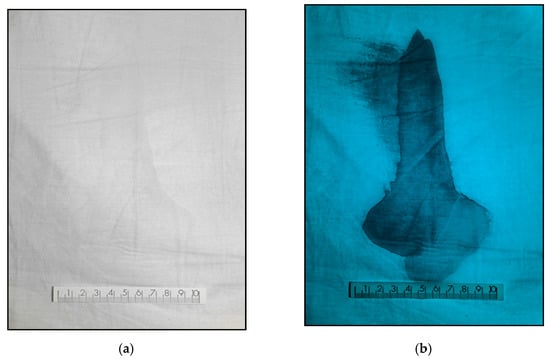 Images of a cotton sheet with traces of latent blood photographed: (a) with a conventional camera illuminated with white visible light and (b) Invespector system using UV illumination 365 nm.
