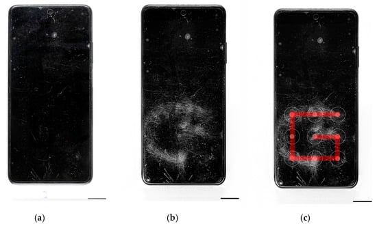Images from a mobile phone photographed (a) with a conventional camera and illuminated with white visible light; (b) captured by Invespector camera and illuminated with IR radiation 950 nm; and (c) the pattern movement recovered to unlock the smartphone successfully.