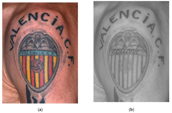 Figure 9 shows how the multispectral camera coupled with an IR longpass filter Wratten 87 is capable to capture the transmittance and absorbance reactions of the different components of the inks used in the tattoo. In this particular case, this individual has hidden a small latent tattoo, with the now readable text “caliente”, under another tattoo of the shield of the “Valencia CF”. Although the ink is injected between 1.5 and 2 mm under the epidermis, the high penetration capacity of IR radiation −850 nm wavelength at an angle of incidence of 90°—cause certain pigments that make up the inks of this second tattoo—cobalt in the blue ink, cadmium in the yellow, chromium in the red—react by transmitting/reflecting the IR radiation, so they partially disappear in the final image. This make the underlying tattoo perceptible as its ink composition—iron of the black ink—reacts by absorbing the IR radiation, that is, darkening the text.