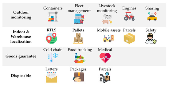Typical use-cases for industrial indoor and outdoor asset tracking and localization. Beyond classical indoor and outdoor use-cases, there are a couple of less know topics, e.g., tracing the food chain or tracking disposable items (icons from Flaticon.com).