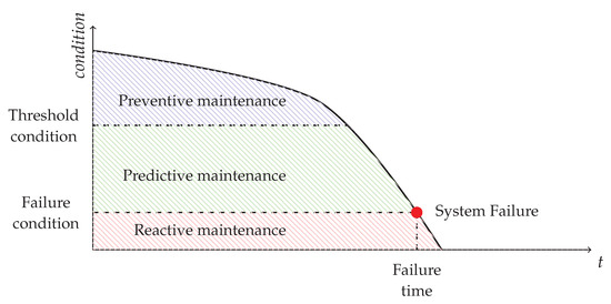 The most widely adopted methodologies are predictive and preventive maintenance. While the first places emphasis on estimating the time of failure to enable scheduled maintenance—and therefore production line down-times—the other aims to establish a regular, periodic maintenance process for preventing failures and keeping machinery operational for as long as possible by expanding its life-time [131,132,133], as shown in Figure 6.