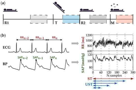 (a) Schematic illustration of the experimental protocol, including baseline resting (R1), orthostatic stress (T), second resting (R2) and mental stress (M). Dashed boxes indicate the windows taken into account with regard to short-term (ST, 300 points) analysis. (b) Representative RR and SAP time series, extracted respectively from ECG and BP recordings, which have been investigated through univariate analysis performed after ST (red arrow) and ultra-short-term (UST, 240 to 60 points, blue arrows) time window segmentation.