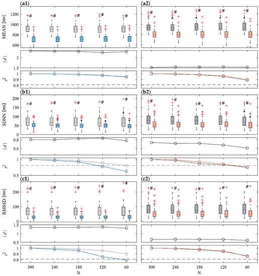 Boxplot distributions (top subplots) of time-domain indexes, i.e., (a) MEAN, (b) SDNN and (c) RMSSD calculated from RR time series during R1 (light gray) and T (light blue), (.1 panels), and during R2 (dark gray) and M (orange) (.2 panels) phases. Statistical tests: #, p < 0.05, T vs. R1 or M vs. R2; *, p < 0.05, ST vs. UST. Central subplots: Cohen’s d (in absolute value) evaluated between each stress condition and the previous rest phase (i.e., R1-T and R2-M) for all the considered time series lengths. Bottom subplots: squared Pearson correlation coefficients computed between a given UST distribution and the ST reference, with a threshold of  (dotted gray line).