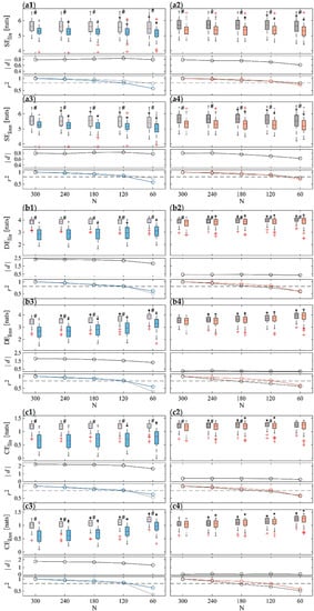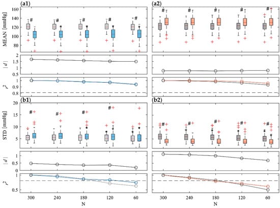 Boxplot distributions (top subplots) of time-domain indexes, i.e., (a) MEAN and (b) STD calculated from SAP time series during R1 (light gray) and T (light blue), (.1 panels), and during R2 (dark gray) and M (orange) (.2 panels) phases. Statistical tests: #, p < 0.05, R1 vs. T and R2 vs. M; *, p < 0.05, ST vs. UST. Statistical tests: #, p < 0.05, T vs. R1 or M vs. R2; *, p < 0.05, ST vs. UST. Central subplots: Cohen’s d (in absolute value) evaluated between each stress condition and the previous rest phase (i.e., R1-T and R2-M) for all the considered time series lengths. Bottom subplots: squared Pearson correlation coefficients computed between a given UST distribution and the ST reference, with a threshold of  (dotted gray line).