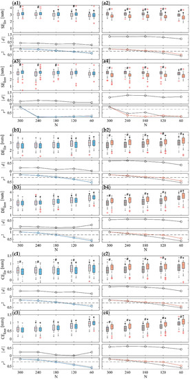 The results of the analyses carried out on RR time series are shown in Figure 4. For both orthostatic and mental arithmetic conditions, the shift from rest to stress highlights significant decrease of SE, DE and CE measures computed with both lin and knn estimators. This variation is most appreciable under the postural stress, in fact statistically significant variations are always reported comparing T vs. R1, for both ST and all the UST distributions and for both estimators. On the other hand, using the lin estimator statistically significant variations are reported comparing M vs. R2, for both ST and almost all the UST distributions for all measures (except w.r.t to CE for N = 60), but only for SE (Figure 4(a4)) using the knn approach. SE appears to decrease while CE and DE tend to increase when decreasing the time series length N. This result is more evident using the knn estimator, in fact statistical analysis carried out between UST and ST distributions highlighted significant differences starting from time series of length N = 240 for almost any measure computed through the model-free approach. For DE and CE computed through lin estimator, the statistically significant differences between UST and ST at T occur only for N ≤ 180 and N ≤ 120, respectively. The Cohen’s d values obtained for lin estimator are higher than for the knn one (see central subplots in each panel in Figure 4). High effect sizes are reported for CE and DE during T, but medium values instead during M; with regard to the SE index, a medium–high effect size is assessed for both physiological state changes and for both estimators. In any case, d appears almost constant at decreasing N (down to N = 120), while a more marked decrease is observed when going to N = 60. Finally, the squared Pearson correlation coefficient (see bottom subplots in each panel in Figure 4) decreases, shortening the time series length N, and still largely shows a high degree of correlation (above the threshold) down to N = 120.