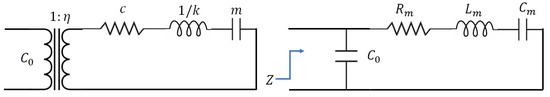 In Equation (12) above, is the motional capacitance when the transducer is in operation and is the static capacitance. The PMUT equivalent circuit model can further explain these parameters.