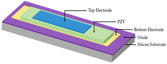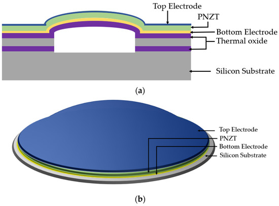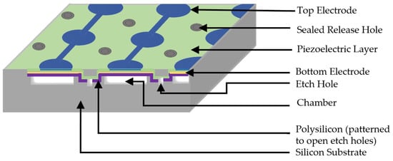 Conventional transducers also have poor acoustic impedance matching with air or biological tissue mediums, limiting their bandwidth, resolution, and energy transfer to load media [1,3]. MUTs are membrane structures with better acoustic impedance matching with load medium, and therefore, they do not require the matching layer usually employed in conventional transducers to achieve broadband operation [2,4]. MUTs are of two types, based on their actuation principle: capacitive MUTs (CMUTs) and piezoelectric MUTs (PMUTs). Capacitive MUTs are electrostatically actuated and require high DC bias, limiting their easy integration with low-voltage electronics. For high performance, CMUTs require a small gap height for better sensitivity, which extends fabrication limitations. Unlike CMUTs, PMUTs are based on the piezoelectric effect, do not require a high DC bias voltage, and are not limited in deflection due to small gap height [5,6].