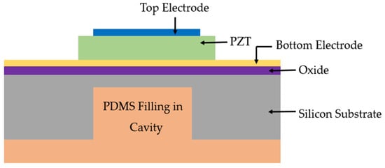 An alternative technique to improve the bandwidth of PMUTs was demonstrated by Wang et al. [63]. The proposed PMUT implements a backing layer through deep silicon etching and polydimethylsiloxane (PDMS) back-filling into the etched cavity, which is formed by the release of the device structural layer through deep reactive ion etching (DRIE), as shown in Figure 12 [63]. To evaluate the bandwidth performance, an impulse response test was performed in water with a 30 V input pulse on the PMUT with backing layer. The PMUT with the backing layer was reported to double the bandwidth compared to PMUTs without the backing layer.