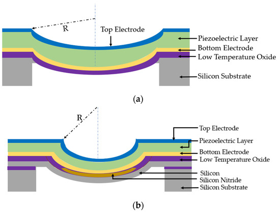 In planar PMUTs, a structural silicon layer is required to ensure non-zero piezoelectric moment along the neural axis of the PMUT structure [58]. In curved PMUTs, the in-plane stress is converted to a vertical mechanical component, which results in a better EMCC and acoustic pressure [58,68]. In curved PMUTs, the piezoelectric layer can serve as the structural layer, so they do not need an extra silicon layer as in planar PMUTs [58]. Curved PMUTs consist of a concave diaphragm with a radius of curvature R formed by silicon wet-etching process, as illustrated in Figure 14a. A curved AlN-based PMUT was developed by Akbari et al. [55] which reported a center displacement of 45 nm/V at resonance, which is 50 times higher than other AlN-based PMUTs. However, the curved structures with the desired radius of curvature render a large portion of the PMUT inactive, reducing the fill factor (transducer active area). Acoustic efficiency of PMUTs increases when the fill factor of the design is maximized [69]. Akbari et al. [70] further developed a residual stress-engineered self-curved PMUT to achieve controllable designs for diaphragm of curvature. The stress-engineered design consists of a thin silicon nitride (SiN) layer with a residual tensile stress of 650 MPa on the inner portion surrounded by 180 MPa of compressive stress by low-temperature oxide, as shown in Figure 14b. After the release of the stresses, the curved structure of the PMUT diaphragm is self-formed. The radial coverage of the SiN affects the center deflection [70]. The curved PMUT with 200 µm radius and 2 um AlN thickness and 50% of SiN coverage reported a center deflection of 2.7 µm and displacement sensitivity of 40 nm/V.