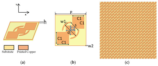 Figure 1. Unit cell for the proposed structure: (a) perspective 3D view; (b) top view; (c) 2D array. - Multiple square patches on a unit cell can cause multiple resonances, resulting in multiple bands of operation. Therefore, placing these patches along the diagonal can result in multiple operational bands [33]. In this way, three squares, C1, C2 and C1, were placed diagonally;