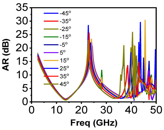 Since the structure of the proposed polarizer is uni-layered, it can be insensitive to large changes in incident angles. Usually, while operating in transmission modes, such converters need to bear these changes and sustain performance for oblique incident angles. To investigate this, the unit cell was analyzed in Ansys HFSS using the change in incident angles of the applied TE wave, and the response variation in terms of the axial ratio was also analyzed. The results are presented in Figure 3 in steps of 10° from 45° to −45°. It is clear that the polarizer performed equally well in the first band of operation (Ku band), which is a remarkable achievement for a transmission-based polarizer. For the second frequency band of operation, the performance in the lower half of the operational band remained unchanged, except for a small frequency shift. However, the polarization conversion performance degraded greatly for ±45° in the operational frequency band higher than the center frequency of band. This performance remained good for ±30° changes in incident angles. Thus, the proposed conversion performance remained stable for ±45° for the first band of operation and ±30° for the second band.