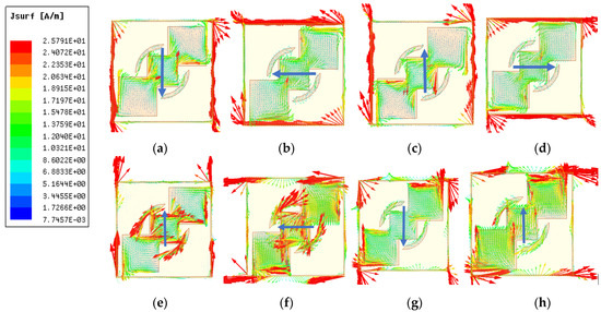 To explain the physics behind linear to circular polarization conversion, surface current vectors were monitored at different time intervals: t = 0, t = T/4, t = T/2, t = 3T/4, with T being the time period for the incident wave at resonant frequency. Figure 4a–d show surface current vectors at 13.58 GHz, whereas Figure 4e–h show surface current vectors at 40 GHz. Figure 4a shows that, at t = 0, the resultant surface current vectors at the unit cells were directed at an angle of 270° from the +x-axis. For ease of understanding, we represent the magnitude of these vectors at the center with the help of a blue line, with an arrowhead showing the direction of surface currents. Figure 4b shows that, at t = T/4, the surface current vectors lay along the -x-axis, manifesting a rotation of 90° from t = 0. At t = T/2, the angle changed to 90° along the x-axis. For t = 3T/4, the surface current vectors were aligned with the x-axis, hence forming an angle of 0° along the x-axis. Thus, increasing the time interval by T/4 results in further rotations of the surface current vectors by an angle 90°.