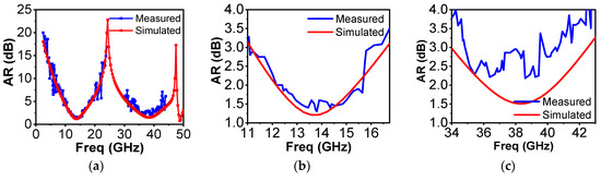(a) Measured axial ratio response; (b) AR within Ku operational band; (c) AR within Ka operational band.