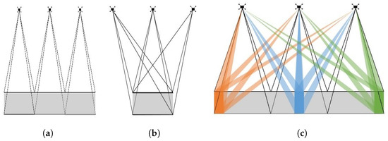 Figure 2 shows the layout of the system, which includes a number of scenes that are imaged at the same time and are close together. Each scene depicted here appears to correspond to the area shown during Spotlight imaging. Its value is proportional to the total distance/time travelled. On the other hand, the point towards which the radar is steered is referred to as the scene centre, . The target position, , can be set to any point in the scene.