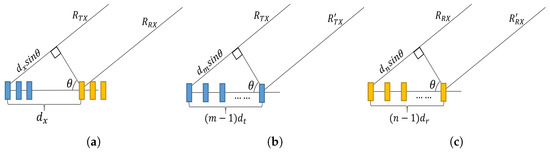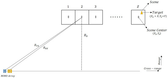 where is the distance between first transmitter and mth transmitter and is equal to . Furthermore, the range for from the zth scene to the nth receiver, as per Figure 3c, can be written as: