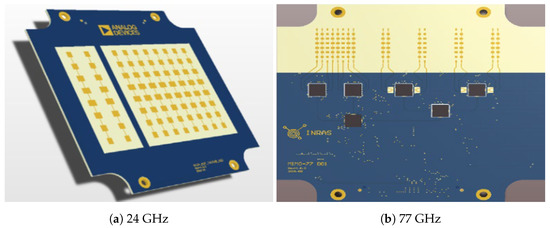 The experiments used a commercial, off-the-shelf linear MIMO array radar operating at 24 AND 77 GHz with two different front-ends, as per Figure 5. The first of these has two transmitters and eight receivers. The latter has four transmitters and eight receivers. It performs according to the parameters given in Table 1.
