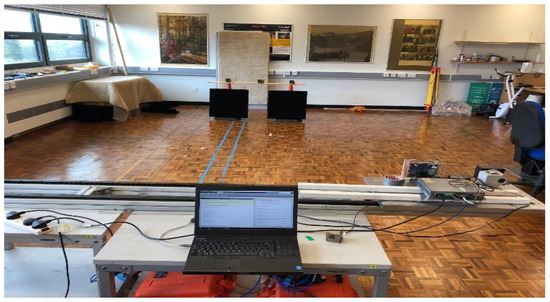 The radar was mounted on a linear positioner with an active length of 2 m to provide platform motion as in Figure 7. Due to the high frequency and the expected fine spatial resolution, the positioner was electronically controlled with a horizontal accuracy of 1 mm. Measurements at each aperture position were performed in a stop-and-go fashion.