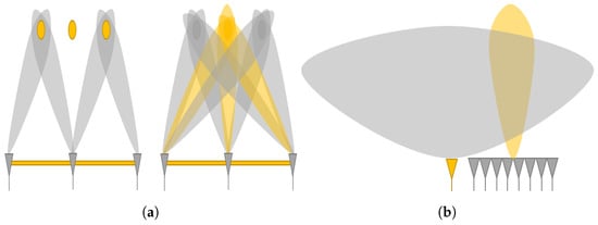 Subsequently, a second experiment was conducted for comparison. In this, only a single transmit element was used and a receive broadside beam was formed from the eight receive elements (Figure 8b), which resembled a Stripmap SAR acquisition and could hence be processed in the according manner. This allowed comparing the proposed imaging mode to a conventional SAR imaging mode.