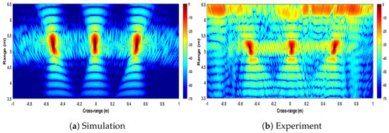 As a sanity check, for the Stripmap acquisition conducted in our second experiment, the cross-range resolution can be calculated to be half the length of the receive MIMO array, i.e., approximately 2.88 cm, which is substantially different from that measured here. Figure 11 depicts the image under the Stripmap processing for both the simulation environment and experiment. Similarly, all targets appear at the expected locations.