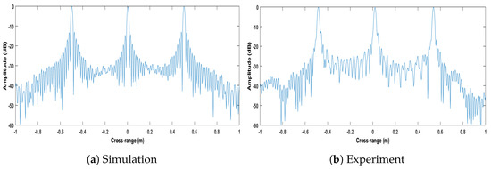 On the other hand, the cross-range resolution is expected to be 2.88 cm, as mentioned above. To confirm this result, Figure 12 gives the cross-sections of the images for the simulated and experimental results. In the experiment, the cross-range resolution was measured to be 2.90 cm. It can, therefore, be stated that the Strip-Spot resolution is that of a Spotlight, rather than Stripmap SAR, and under the specific experimental conditions, the improvement in cross-range resolution compared to a Stripmap SAR is approximately 91%. The improvement comes from the Spotlight processing, which evaluates the data taken by longer aperture lengths. In other words, the integration time affecting the cross-gap resolution was almost doubled compared to the Stripmap mode.