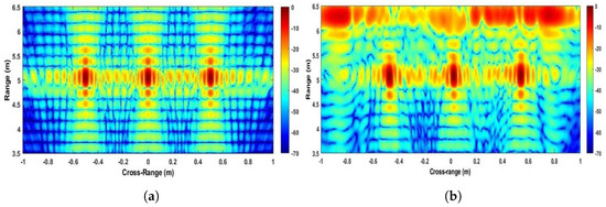 can be calculated via Equation (32); the corresponding scene size can then be found. The situation here is whether the beamwidth and, thus, the size of the illuminated scene vary, which scene size will be used for image formation, and what the resulting image will look like. To achieve this, the user must choose between two options. If the broadside beam is used as an example, which is , the scene size for a range of 4 m will be 0.9 m × 1 m. On the other hand, if steering is applied from to , the beamwidth becomes and the result is 0.9 m × 1.45 m. Although the difference is not significant, defining the scene size in terms of broadside beamwidth simplifies the application of the concept. However, it should be remembered that the applied limit may result in overlapping or pixel loss in areas corresponding to the scene’s borders.
