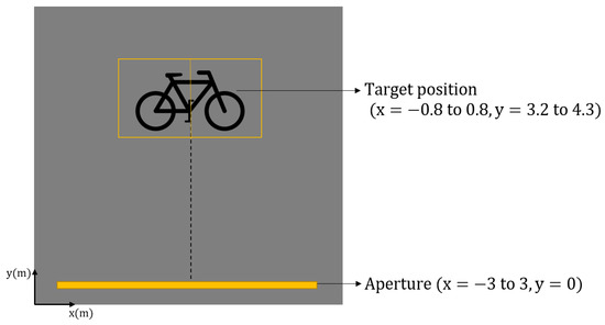 In this experiment, a bicycle was utilised as the real-life target. Figure 13 illustrates the experimental design for the investigation. As may be observed, a total aperture length of 6 m was employed. The target bike was vertically symmetrically positioned relevant to the pedals of the target bike. The bike measures 1.6 m × 1.1 m in size. Essentially, two scenes were employed, with the scene centres at (0.4,3.8) and (−0.4,3.8) serving as the steering points for the beams.
