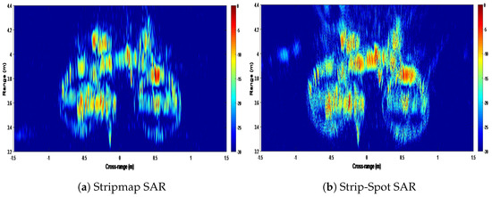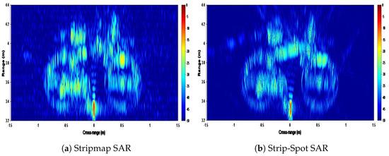 Although the target is clearly displayed, it is very difficult to verify cross-range resolution. As stated in the previous section, a second experiment was performed on the same scene, the only difference being that a high-reflectivity corner reflector was placed just to the right of the bicycle pedal. The results of this experiment can be seen in Figure 17. As in Figure 15, the two results are evaluated as “Stripmap” and “Strip-Spot.” Although the corner reflector dynamic range also changes, the bike is seen to the same extent.