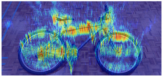 When Figure 15b and the bicycle photo in Figure 14b, as taken prior to the experiment, are superimposed, it can be seen that the picture and the photo overlap in Figure 16. It can also be seen that different reflections are gained from different materials. For example, the reflectivity of the metal parts of the bicycle, which itself consists of metal, aluminium, plastic, and rubber, is higher, which is the expected result.
