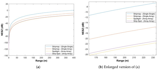 The key here is that Strip-Spot has a sensitivity close to, but slightly worse than, Spotlight. Furthermore, assuming the acceptable SAR sensitivity to be −25 dB, this gives us an acceptable operating range for this type of radar and this type of imaging mode to about 190 m. This range can be considered ideal for short-range applications. It gives an indication of the feasibility of the concept. Furthermore, this result confirms that the system promises high-resolution continuous-swath imaging up to the range above, in the range of .