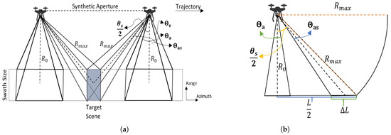 However, it is different for the target of interest if performing Spotlighting or there is a look angle. Hence, the broadening in the azimuth beam causes the enlargement in the size of the azimuth in the scene. The geometry of this phenomenon is shown in Figure 20a, where is the minimum range, is the maximum range, is the array beamwidth, is the steering angle, and is the beamwidth at .