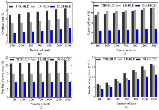 According to Figure 2a,b, compared with the THR-HLD and LR-HLD algorithms, the DLM-HLD algorithm proposed in this paper detected the least number of overloaded or underloaded hosts in the VM consolidation. For a 1500-node data center, the DLM-HLD detected 56.8% and 40.6% fewer overloaded hosts and 58.9% and 59.5% fewer underloaded hosts compared to the THR-HLD and LR-HLD, respectively. The THR-HLD algorithm is based on the current resources utilization as the criterion for detecting a host overload or underload, without considering the dynamic changes in the resources load. As long as the current resource utilization exceeds the set threshold, the host is judged as an overload or underload, and even occasional load fluctuations will detect the hosts overload or underload, which leads to the misjudgment of the hosts overload or underload in the VM consolidation, thus increasing the number of overloaded or underload hosts. Although the LR-HLD can predict a future resources utilization, it cannot predict occasional load fluctuations. The DLM-HLD algorithm considers the dynamic load mean of resources over a period, which not only accurately judges the trend of resources usage but also filters out occasional load fluctuations, thus effectively reducing the misjudgment in the host load detection.