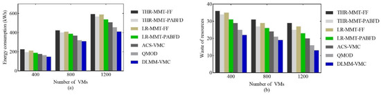 Figure 3a shows the energy consumption comparison. For the data center with 1200 VMs, the DLMM-VMC reduced the energy consumption by 30.8%, 27.7%, 30.3%, 19.1%, 23.5%, 19.3% and 9.8% compared with the THR-MMT-FF, THR-MMT-PABFD, LR-MMT-PABFD, ACS-VMC and QMOD, respectively. On the one hand, energy consumption was a major optimization objective in the DLMM-VMC, and the DLM-DLH method effectively reduced the number of active hosts. In addition, the resources waste was also our optimization objective. Figure 3b shows that the DLMM-VMC method has the least resources waste, which proves that the DLMM-VMC makes full use of resources so that it can minimize the active hosts’ number when deploying the same number of VMs. On the other hand, the DLMM-VMC optimized the heuristic factor of the ant colony algorithm. When selecting the placement hosts, the optimization heuristic factor fully considered the comprehensive resources utilization and resources waste of the host and selected the host with less resources waste under constraints. Therefore, compared with other algorithms, the DLMM-VMC effectively reduced the energy consumption.