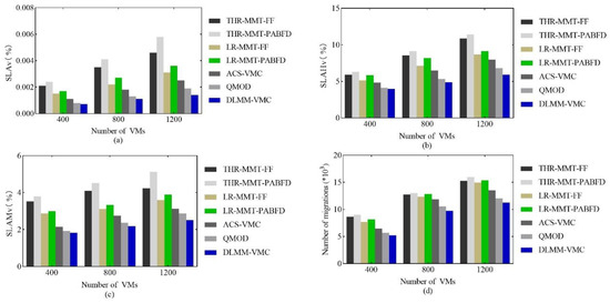 Figure 4a illustrates the SLAv comparison. The results show that the DLMM-VMC has the best performance in SLAv, followed by the QMOD, and the THR-MMT-PABFD has the worst performance. For the data center with 1200 VMs, the DLMM-VMC SLAv were 73.6% of the QMOD, but was only 24.1% of the LR-MMT-PABFD, which proved that the DLMM-VMC algorithm effectively guaranteed the QoS. The SLAv were composed of SLAHv and SLAMv. In order to analyze the SLAv in more detail, we further analyzed the SLAHv and SLAMv.